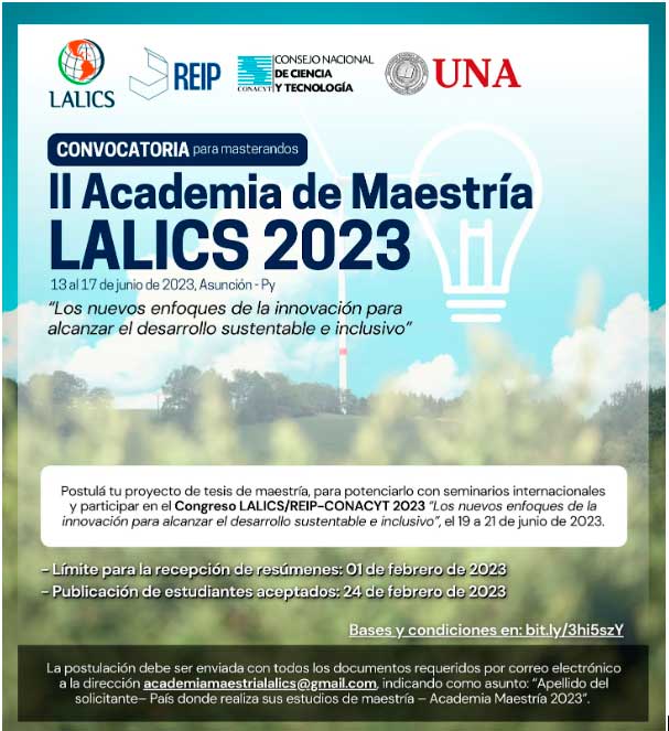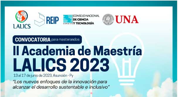 La Red LALICS (Red Latinoamericana para el estudio de los Sistemas de Aprendizaje, Innovación y Construcción de Competencias), la Red de Economía de Innovación de Paraguay (REIP), el Consejo Nacional de Ciencia y Tecnología de Paraguay (Conacyt) y la Universidad Nacional de Asunción (UNA) convocan a la II Academia de Maestría LALICS “Los nuevos enfoques de la innovación para alcanzar el desarrollo sustentable e inclusivo”.